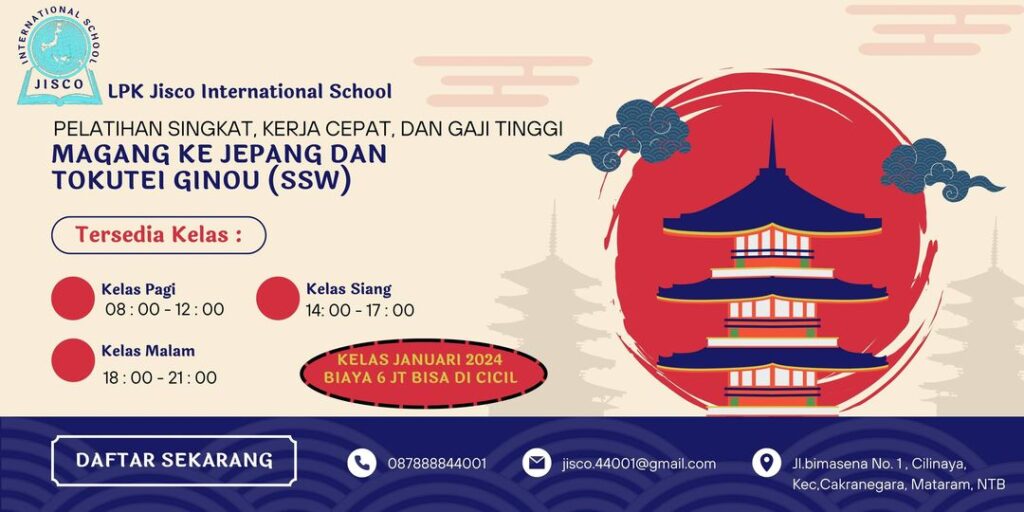 Info Pendaftaran Segera daftrakan diri anda 1 min read 2 years ago admin Di buka kelas baru,,… untuk bulan Januari 2024 segera daftrakan diri anda.Continue ReadingPrevious Sukses kerja ke Jepang.